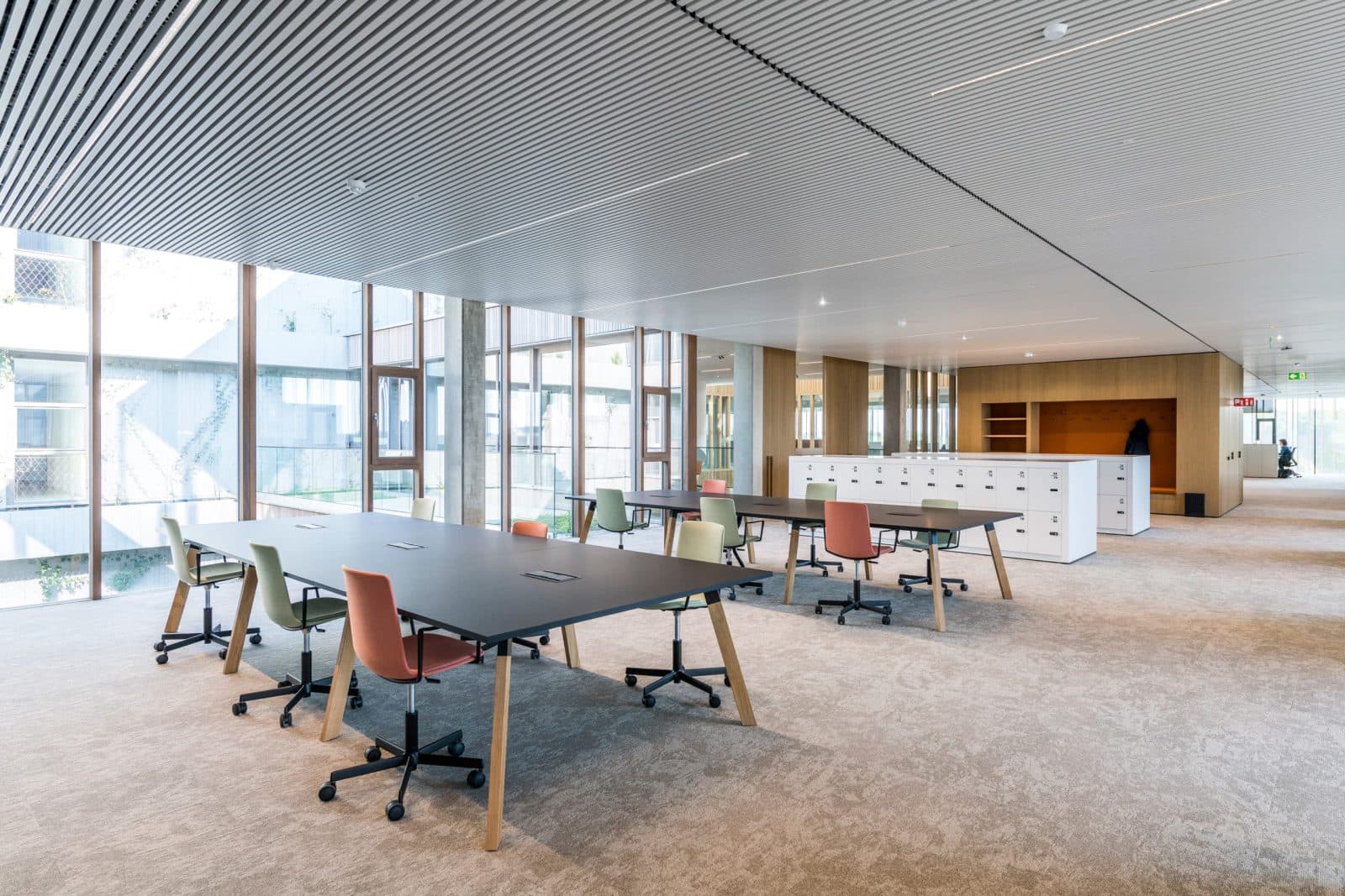 In de polyvalente zaal, de demo-keuken en de cafetaria zijn de lichtarmaturen geïnstalleerd tussen het houten lamellenplafond van Hunter Douglas. Hiervoor hield Multiline rekening met alle eigenschappen van het plafond. De armaturen zijn bijvoorbeeld aangepast aan de hoogte van de lamellen: Rekta 40.