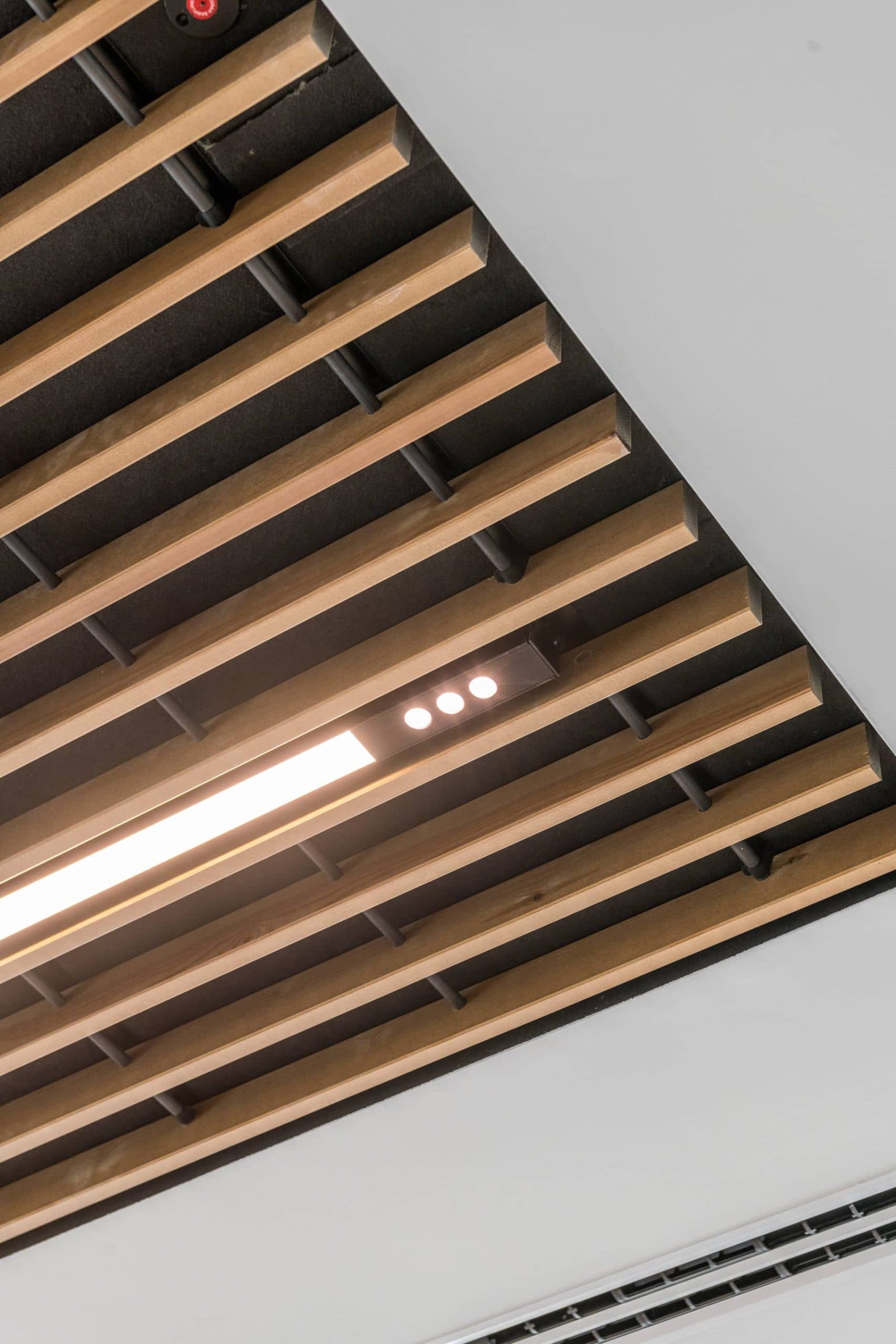 Im Mehrzweckraum, in der Demoküche und in der Cafeteria wurden die Leuchten zwischen der Hunter Douglas-Holzlattendecke installiert. Dabei berücksichtigte Multiline alle Eigenschaften der Decke. So wurden beispielsweise die Leuchten an die Höhe der Lamellen angepasst: Rekta 40.