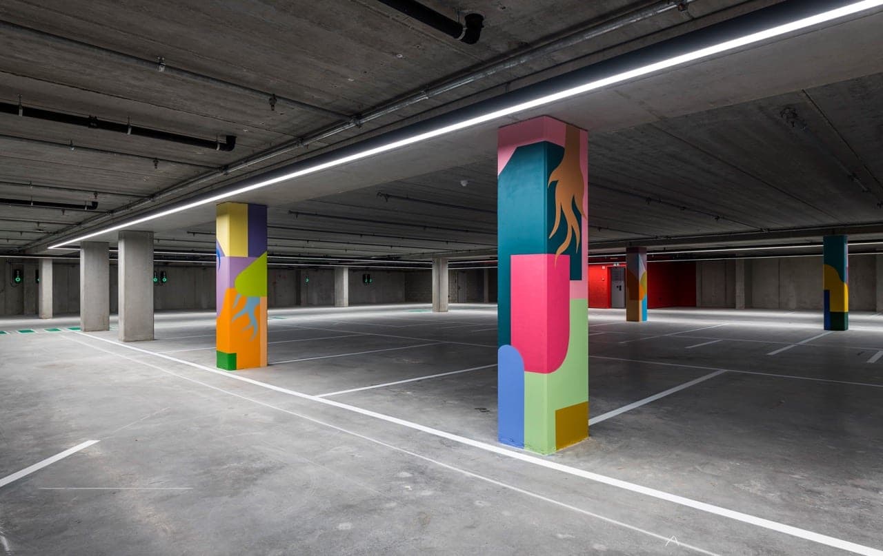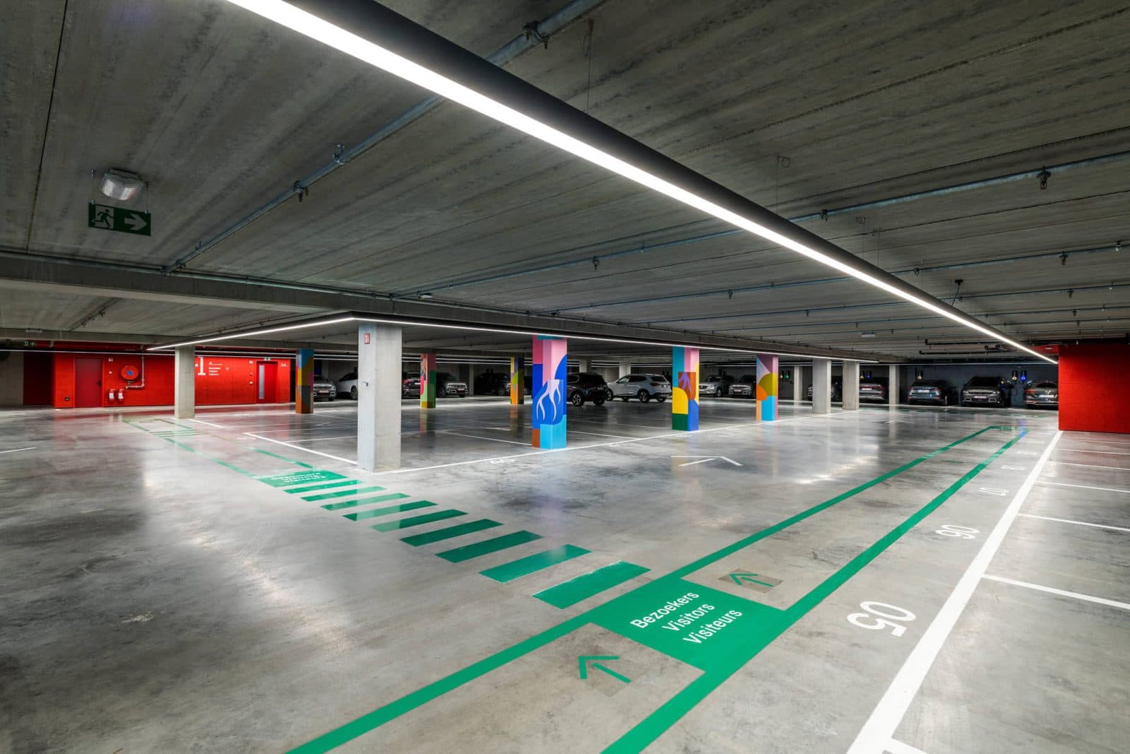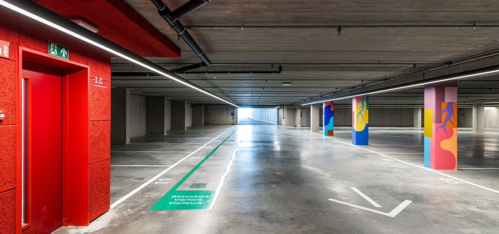 Die Tiefgarage wiederum ist mit sehr langen, schlanken Leuchten ausgestattet: Rekta 80. Der Parkplatz bietet Platz für etwa 60 Fahrzeuge. Die Leuchten werden an die Konturen der Verkehrsflächen angepasst und die gesamte Technik ist hier integriert. Mit der DALI-Steuerung kann der Kunde die Beleuchtung im Parkhaus nach seinen Wünschen programmieren.