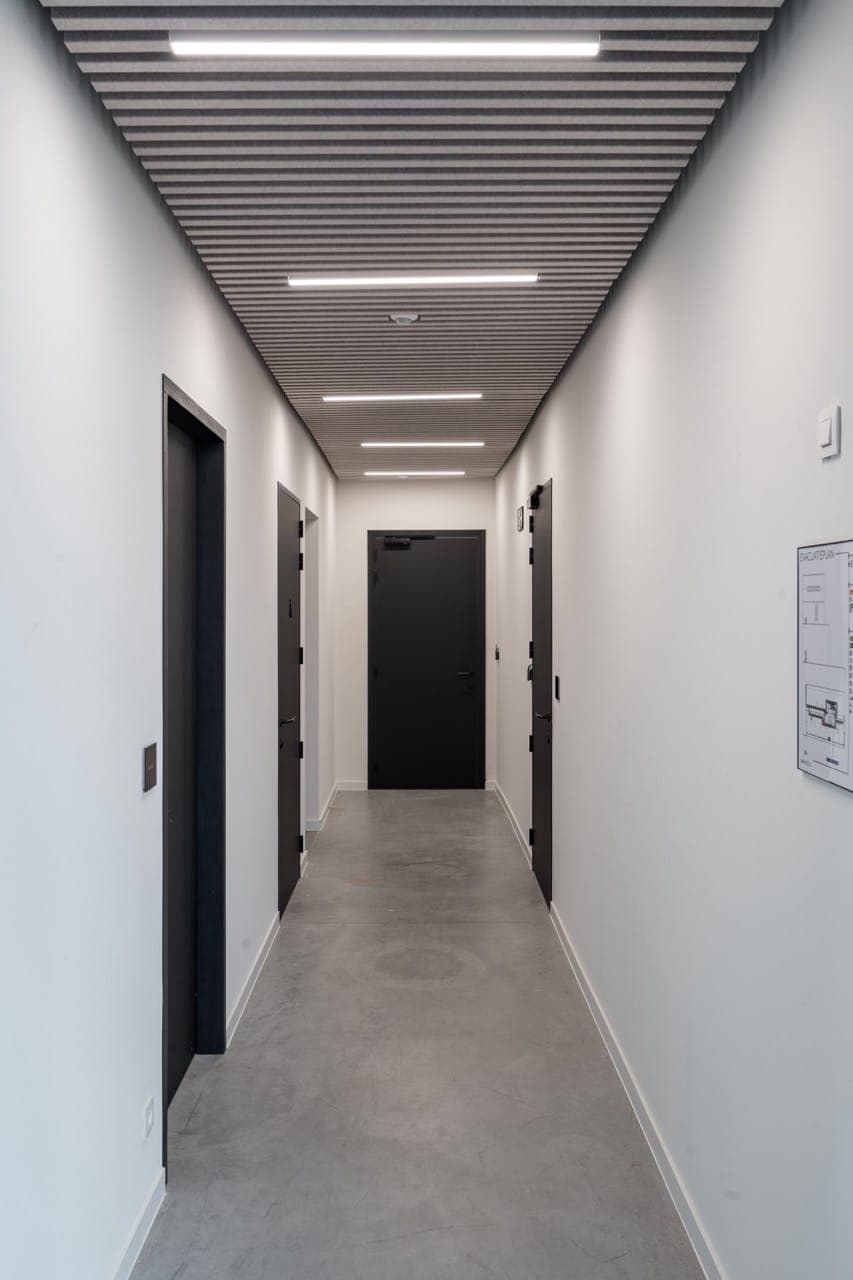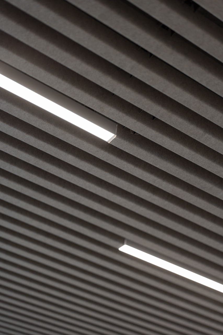 Nos luminaires Rekta 40 s’alignent parfaitement à la hauteur des lames en feutre, en faisant le choix idéal pour ce projet. En remplaçant certaines lames par nos profilés, nous avons créé un design harmonieux où l’éclairage s’intègre naturellement au plafond. Les profilés et diffuseurs blancs offrent une esthétique raffinée et uniforme.